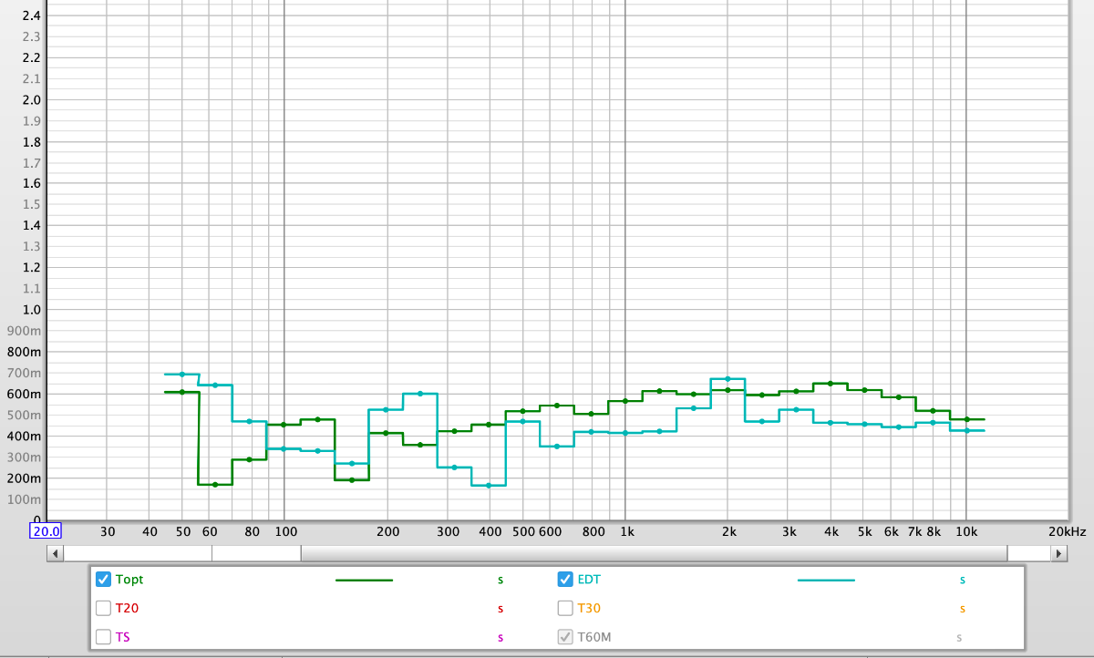 Soundman2020 wrote:Source of the post It would be excellent if you could post the actual MDAT file here on the forum, so we can examine it in more detail. There's not enough visible in your images to judge accurately. What I can say is that the decay times are far too long to be useful for a control room. Right now, they seem to be around 400 to 500 ms (some go up to nearly 700 ms). That needs to come down to around 200 ms, give or take a bit, and it needs to be even across the entire spectrum (right now, you have large variations between adjacent bands).