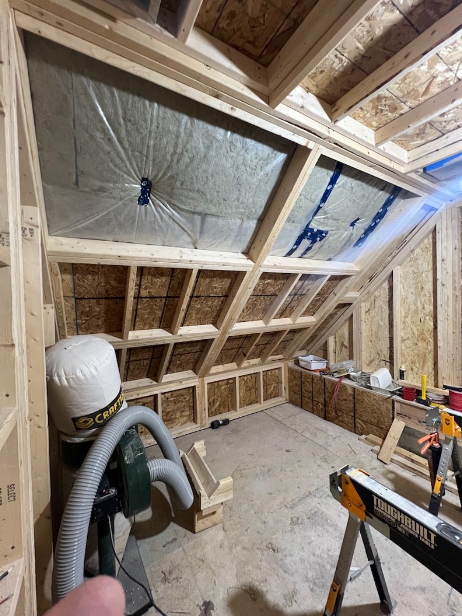 Here I closed off the room by putting up the 3/4 OSB on the back wall. I still need to install the drywall on the outside before hooking up the duct system to the baffle boxes.