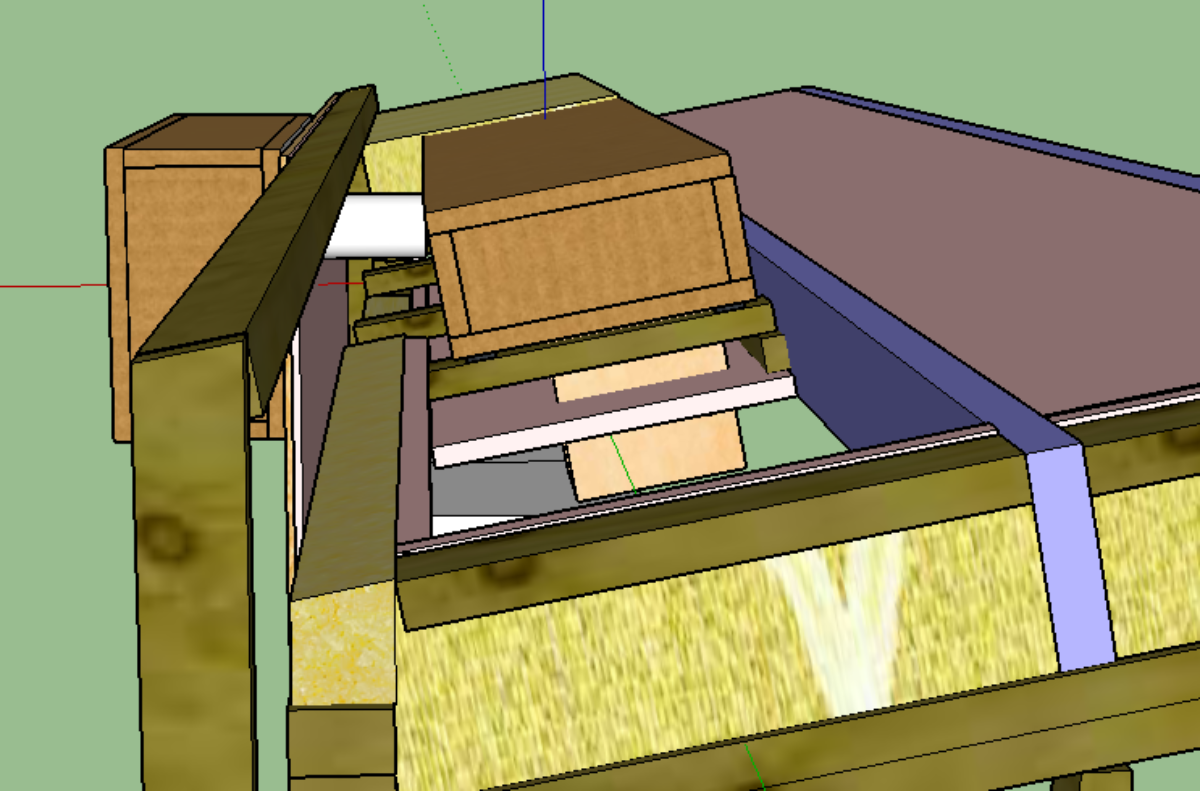 First a shot for context with roof removed.The supply and return connections between outer and inner silencers will be 5” flex duct – a short run on the supply and long one (6.5m) on the return as the return will be located at the other end of the room. The outer return silencer will be located inside my workshop (next to the outer wall supply unit). I wasn’t intending to use insulated duct between silencers – in any event it will be running through my wall/ceiling gap insulation.The supply registers will be located just above the mini-split. In the images below you can see how I’m dropping the hard inner (inside out) ceiling where the silencer sits – all of these are cut away views of the supply side silencers that are either side of the wall that separates my shed from my studio.And here’s the inside of the silencers. Sorry about the rough sketchup work – my first iteration was nice and tidy but progressive edits have exposed a lack of skill.