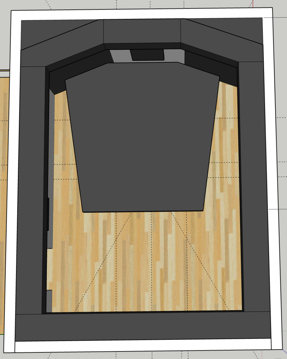 This implies that the soffit face must be solid, hard, massive, rigid, and extend outward around each speaker for as far as possible.Putting corner traps in as many corners as possible, is a good thing! Absolutely! But corner traps in the front corners of the room are less effective than traps in the rear corners.So in this mock, I have treated the front half with deep corner traps, and a nice soffit trap that goes all the way around the room.