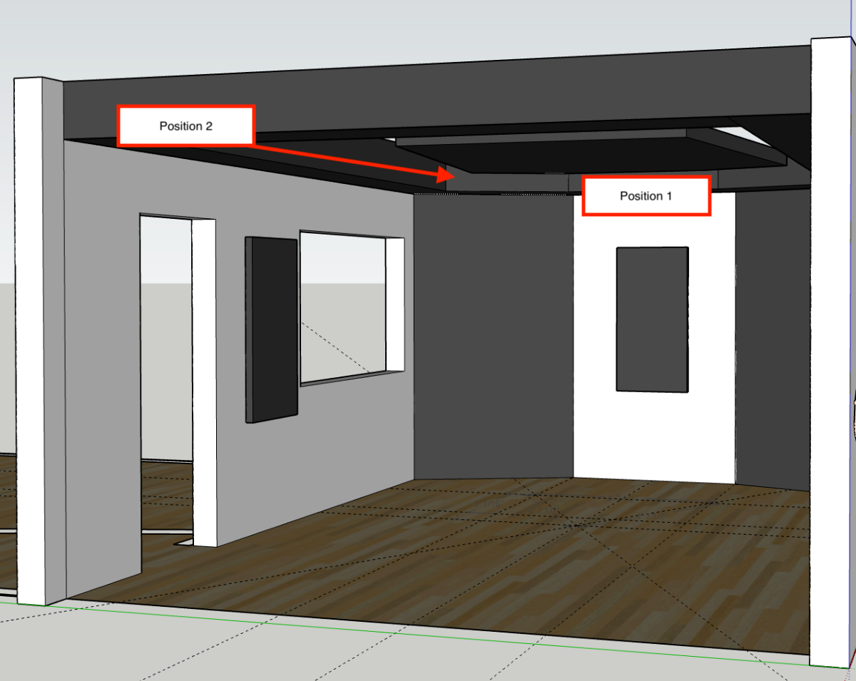 Likewise in the horizontal direction: the general rule is that the soffit baffle should be at least three times the diameter of your low-frequency driver. So if you have a speaker with an 8" woofer, then you want the soffit baffle to be at least 24" (60cm) wide. Wider is better. An even more solid "rule of thumb" is simply that the baffle should be at least a 1/4 wavelength of the lowest frequency that the speaker will produce. That's hard to do in the majority of rooms! But it's a good goal to keep in mind, and will put at the forefront the basic need to make it as wide as you possibly can.Clouds are good. Deep clouds are better. Angled clouds are better still (higher above your head, lower towards the speakers), and hard-backed clouds are even better yet! Shape isn't that important, so you can shape it any way you think looks good, but do make sure that it completely covers the first reflection points up there, and also covers the areas that could be sending too many unwanted reflections towards the back wall, side walls, or rear floor. This might help: [url=https://digistar.cl/Forum/viewtopic.php?f=9&t=2&p=2Raytracing assistant for Sketchup, for visualizing speaker dispersion[/url]The ceiling cloud is about 8'x10' trapezoidal and will be 4" deep and 3" off the ceiling to account for LED lighting that I will be putting on top.Are they strategically located at the first-reflection points for the mix position? Do they completely cover those points? Also, in general it's better to have treatment panels of differing depth and differing wall gaps, to avoid over-treating one specific frequency band. Many rooms end up with a "death valley" in their time-domain responses somewhere in the region of 150Hz to 500 Hz for this very reason: Overt-treatment with 4" deep traps. Make some of them 6" deep, or vary the air gap behind them, or angle them, or something! To make sure that you are not killing one part of the spectrum at the expense of another part.The 2x4 panels scattered throughout are 2" panels made with 703.Everything I've said above is pretty much the opposite of what you'd need at the back of the room for acoustic tracking! Because it is what a Control Room needs, on order to function as a Control Room.am going in the right direction and how to keep the back of the room both controlling some of the bass modes and being a "alive" for vocals or acoustic guitars....