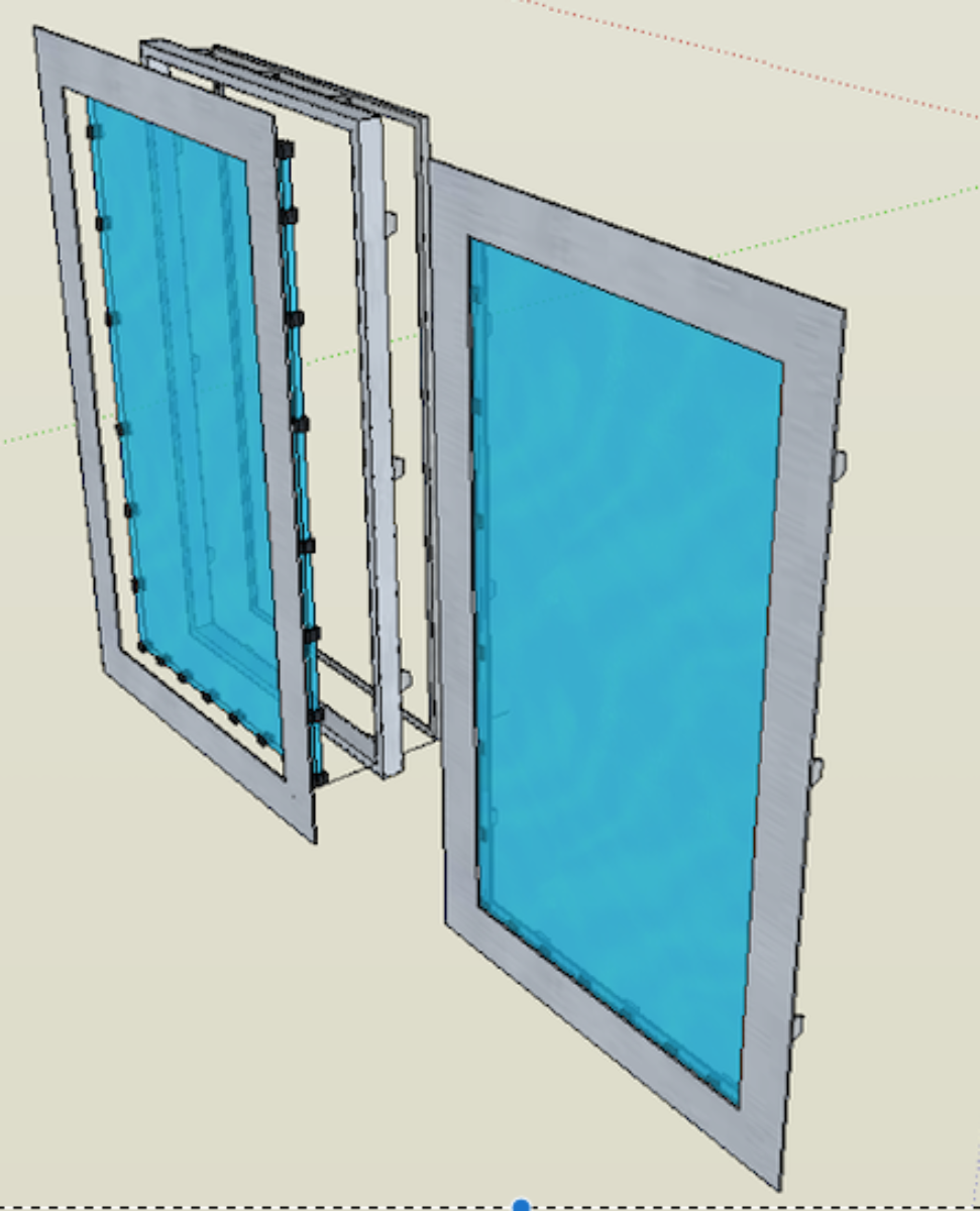 Onto the exterior aluminium window frames, here is my first design proposal. I'm looking at 6063 Aluminum for the frame construction which would be powder coated white. My fabricator and I came up with a three piece design that would sandwich the 5/8th laminated glass pane. The pane would sit in neoprene / rubber setting blocks on three sides. Note that piece C sits inside piece B.