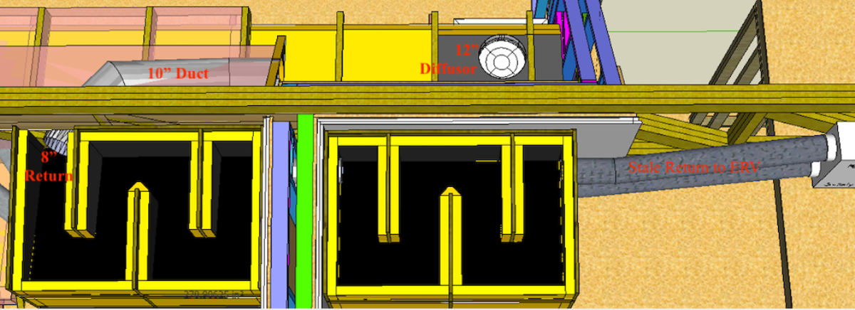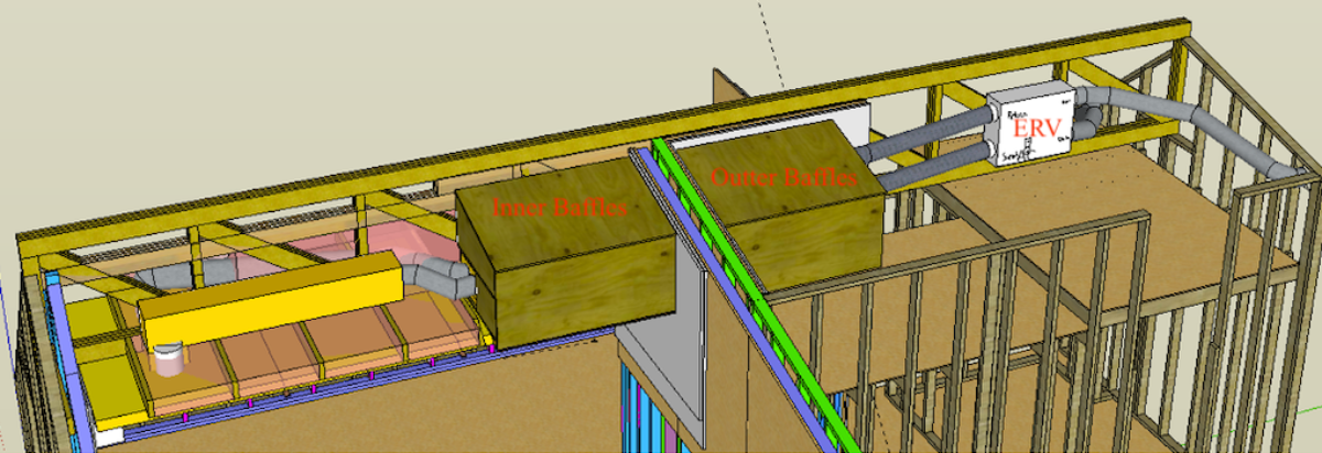 Here is the 2nd draft of my baffle boxes and ducts. Baffles built with 3/4" birch plywood and 2" Duct board. I'll be working mostly alone so I'll run my Panasonic Intellibalance FV-10VEC2 ERV at 50CFM (low setting) most times. The ERV has 6" ins and outs so I will use 6" flexible ducts between the ERV and outer leaf baffles boxes.