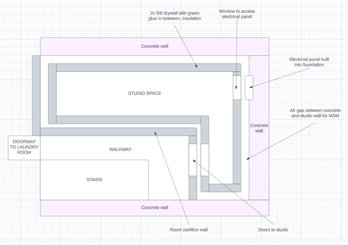 I live in a townhouse condo and have other units on either side of mine. I will be using a room in the basement for the studio which has 3 concrete walls and a standard wall which separates the main room from the laundry room.