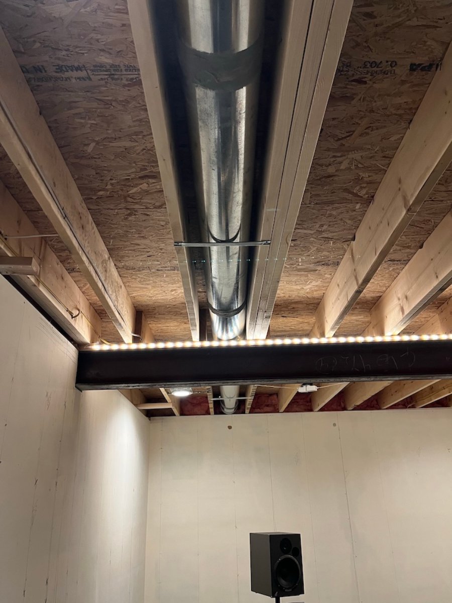 2. An exposed 8” HVAC duct runs the full length of the studio space between the joists (figure 5-2, below). At the front of the room near the speaker setup, the duct opens up into the morning room above the front of the studio space through a 9” x 4” floor register.