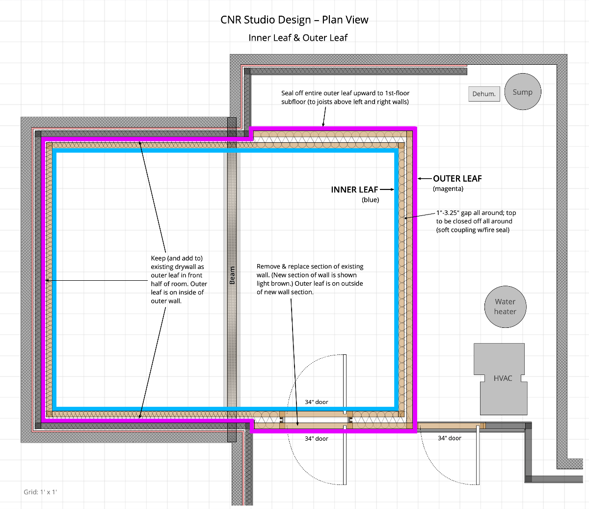 You’ll notice that in the front half of the room, the plan places the outer leaf on the inside of the outer wall (the outer of part my double-stud wall), making the space between the inner leaf and outer leaf narrower than in a normal double-stud wall. Also in the front half of the room, the double-stud wall runs along and in close proximity to the exterior wall of the basement.