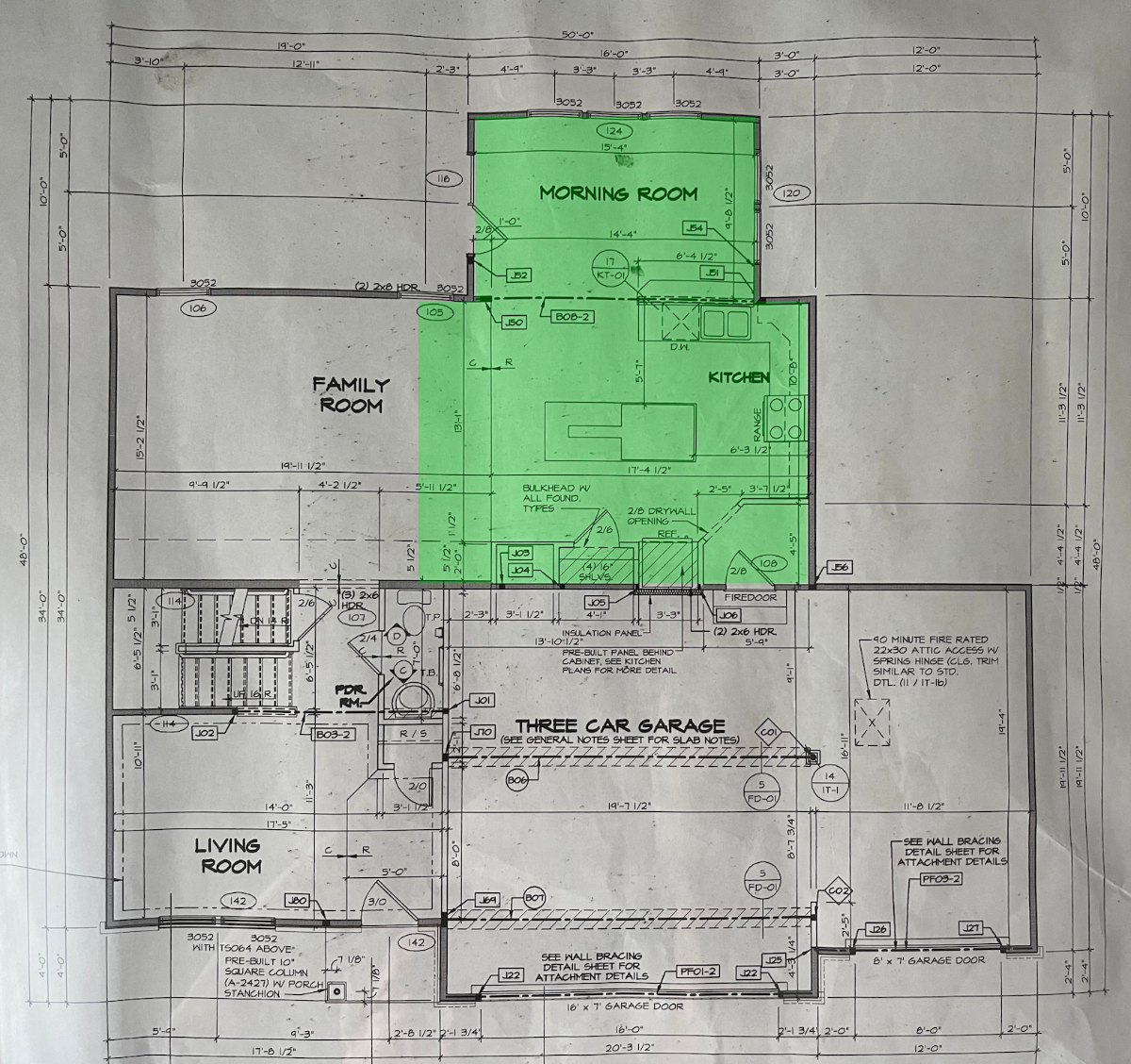 Figure 3-2 is a photo of a framed floor plan that the original owners left for us. The space I have to work with is the area of the basement below the green highlighted area. Most of the first floor—including the family room, kitchen and morning room—is a single open space. Our bedroom is above the kitchen, two floors directly above the studio space.