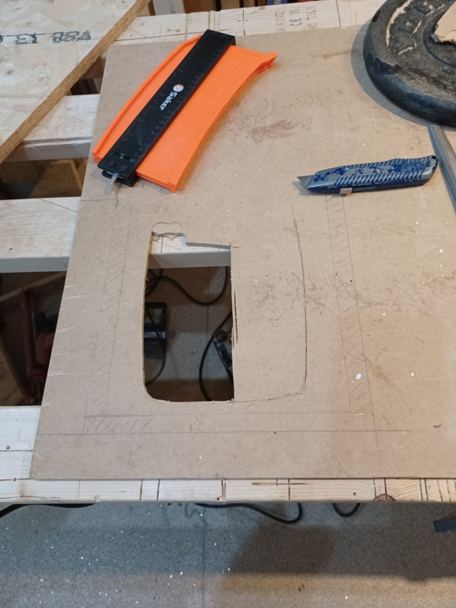 The test baffle has a rectangular hole for the speaker, but the speaker is egg shaped, so this won't do. I built an MDF router template for cutting speaker shaped holes in the final MDF baffle faces. It's sized and shaped to give a few mm clearance around the speaker so the baffle face won't touch it at all. Quite an involved process! First, use a contour tracing tool to trace one edge of the speaker onto the MDF board.