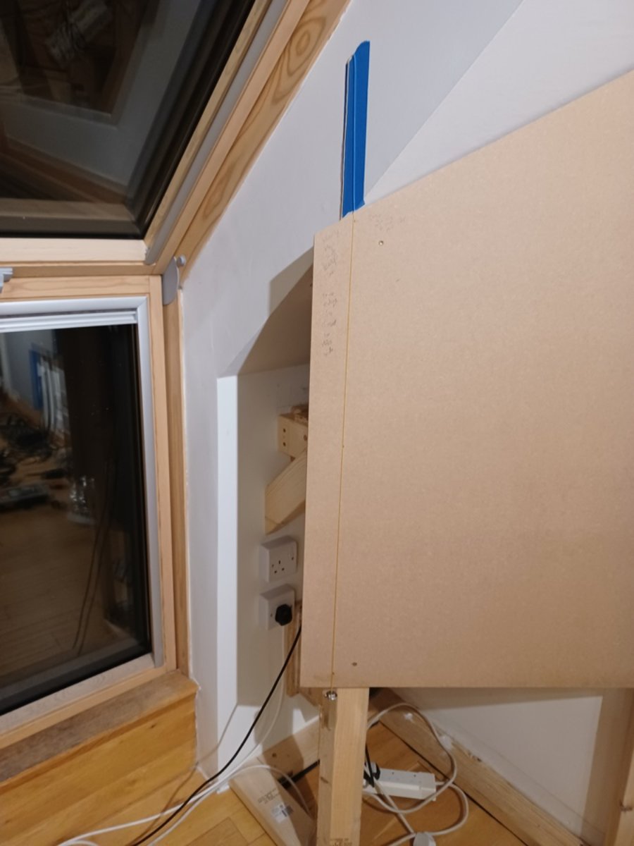 The left knee wall is 25mm longer that the right knee wall. I've built the soffit structures exactly the same size though, in an attempt to make each side sound as close as possible. This means there's a 25mm gap to the right of the left soffit structure. This was anticipated a while back in the thread, and Stuart suggested padding it out with something like an acoustically transparent baffle. Good plan, but it's only 25mm, and maybe I could get away with having a slightly larger baffle face one side?