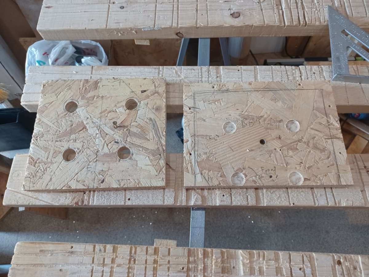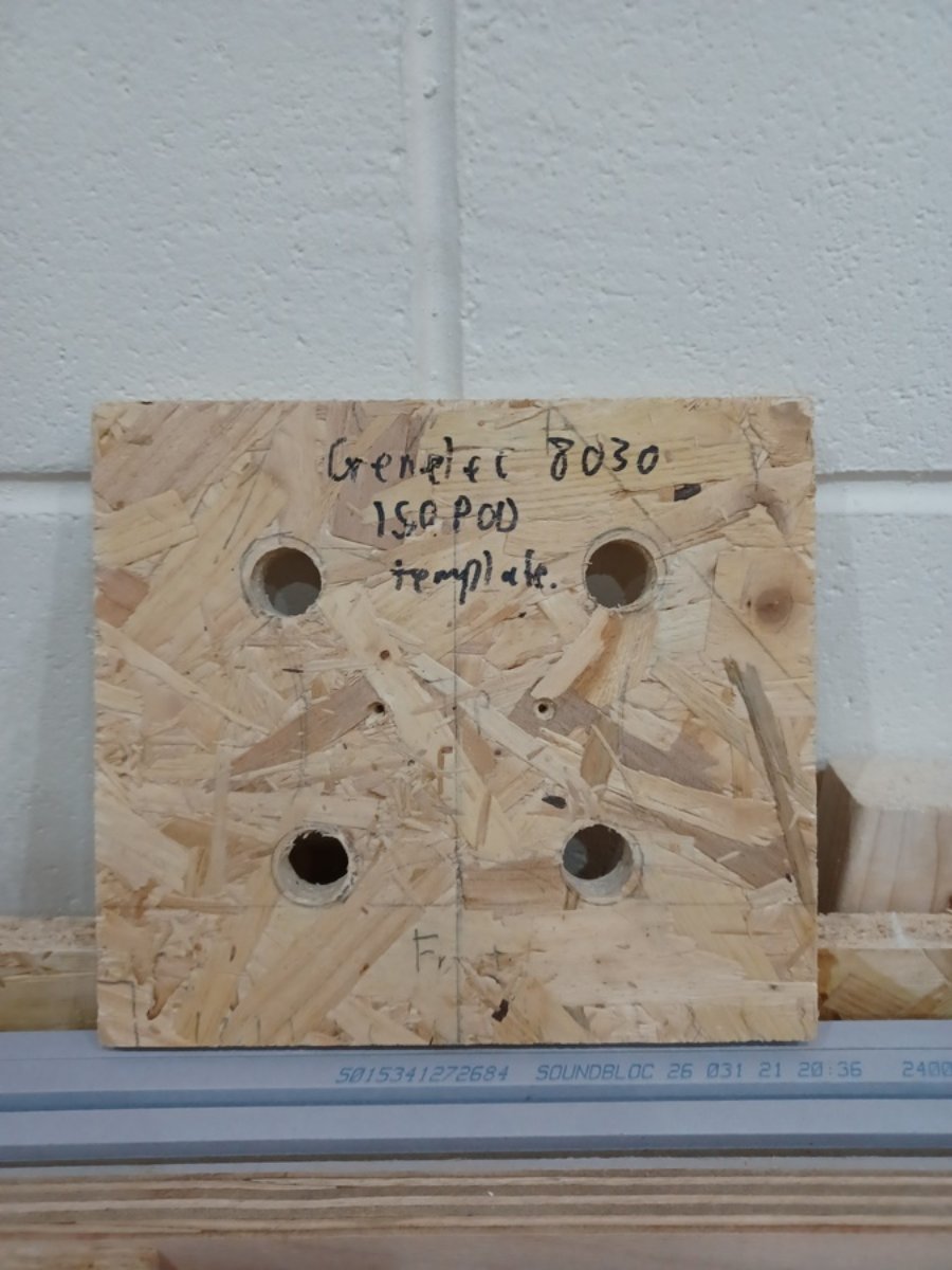 Router template made by carefully transcribing the location of the feet then drilling 22mm holes.