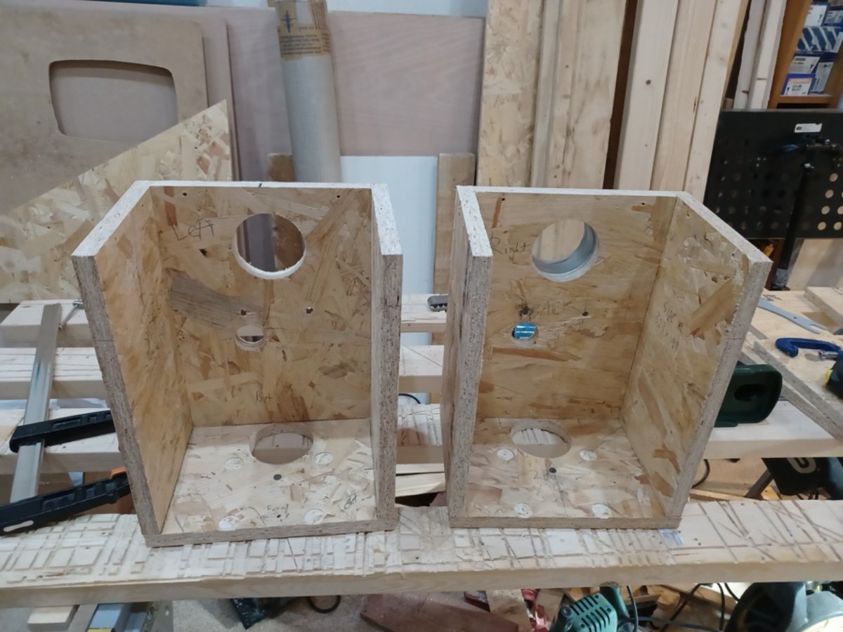 Speaker boxes coming along. I drilled an 80mm diameter hole for the upper duct and a smaller hole for cables and DIP switch access. There will be another 80mm duct hole in the bottom of the speaker, but I have to wait until later in the build until I determine the exact location of the speaker box so I can make sure that and the corresponding hole on the speaker shelf are aligned.