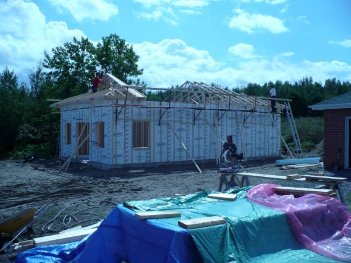 The following things were given to contractors: excavation, concrete, fabrication of trusses, front brick wall, heating system (except pex installation), electricity job, gutters. Everything else was done by me with the help of a more experienced carpenter, family and friends. I'm not very experienced at construction but I am able to use a hammer, a drill or a saw! A final word: there is no question of undoing what has been done, that is to say removing construction materials already installed, unless I absolutely have to in order to achieve my soundproofing goal.