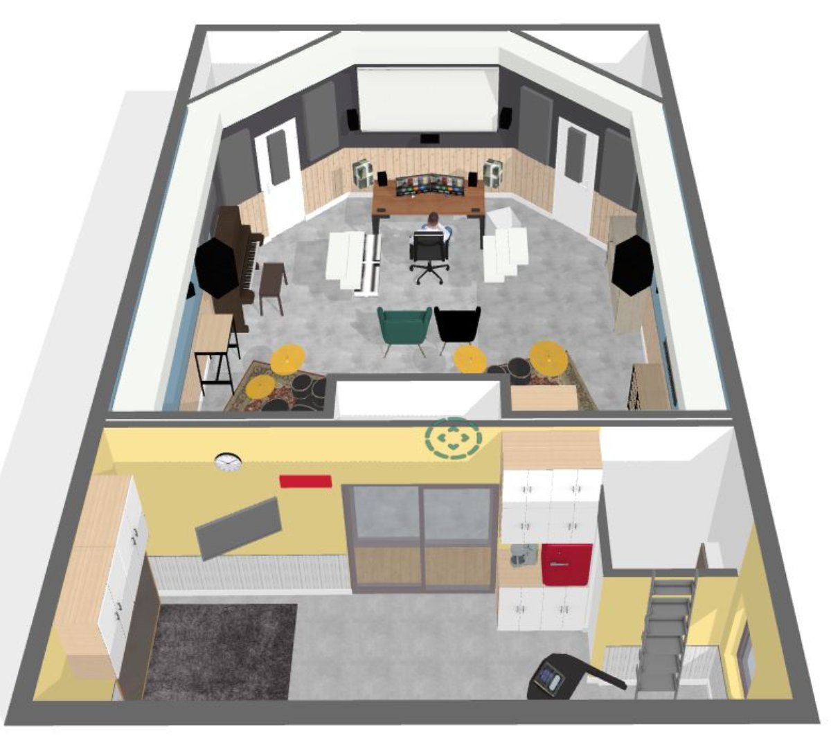 Here is 3D images where we can better visualize the whole thing and we can see the projection screen, the different monitors, some ideas for the location of acoustic panels (to be confirmed later). We can also see the soffit that goes all around the studio and will contain the ventilation ducts and recessed lights (the air exchanger (ERV) and soffit in the gym do not appear on this plan). I don't have much talent in interior design...it's a draft. More details in a future post. I want to sort out the soundproofing issue first.