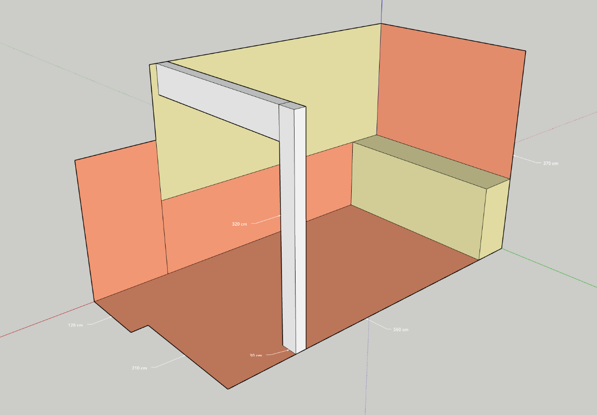 I’m renting a 20m2 space in an open plan warehouse and building a new, one-room writing/mixing studio (I make production music for a living). My neighbours in adjoining spaces are artists/artisans of various persuasions. Some of them would probably be bothered by drums/amps and some will make similar levels of noise themselves. My space is in the corner of the basement. The existing walls are made of mixed materials, some parts concrete, some brick, some plasterboard stud wall (in the sketchup drawing below you can see plasterboard marked in beige and concrete/brick in orange). The floor is concrete and the ceiling looks to me like concrete joists with smaller concrete blocks laid between them (I don’t know what this is called, I’ll share a photo below). The ceiling height is 3.7 metres and my floor area is roughly 5.6*3.3 metres. My plan is to build a standard two leaf system. I have a limited budget to devote to this as the lease is limited to three years, after which the space will get torn down, so I’m hoping to do the minimum necessary to achieve the isolation I want. I'm hoping two layers of air-tight 13mm plasterboard with reinforced stock "acoustic" doors and baffled air inlets/outlets will get me there.