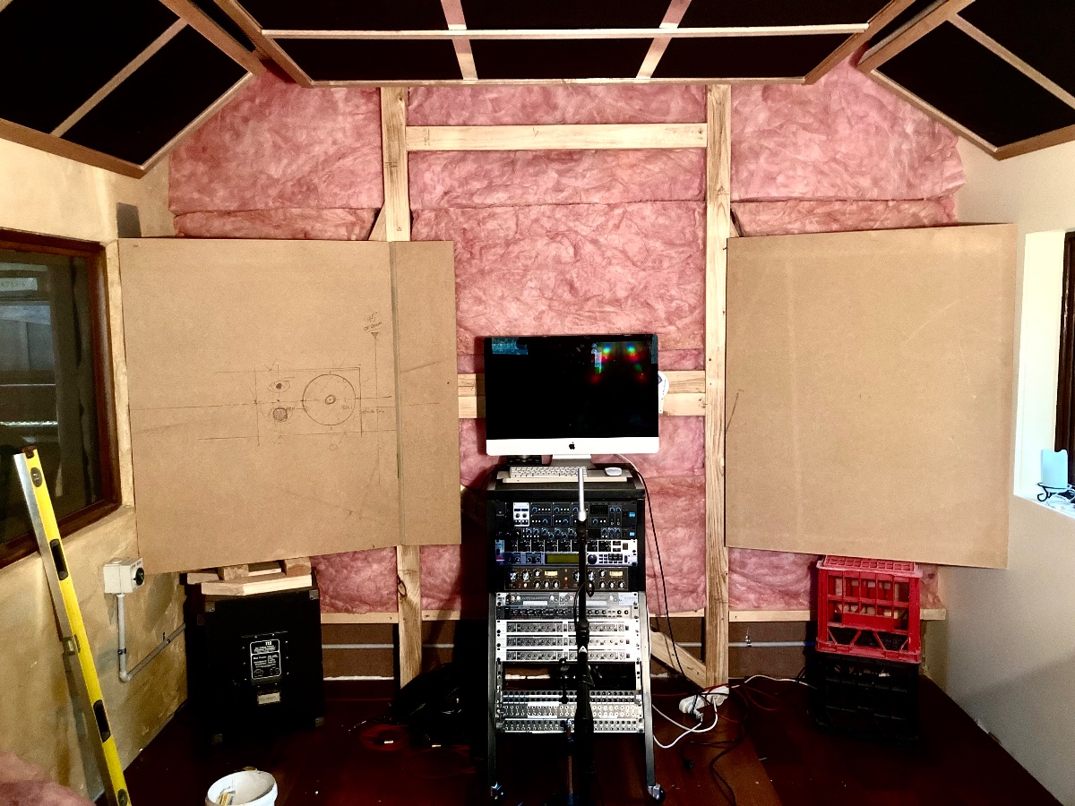 The wall on the right of the chair is cinderblock (beser brick) rendered both sides and hung with 2 layers of 16mm Fyrecheck drywall on acoustic hangers with tontine insulation hung 2cm off of the concrete floor.