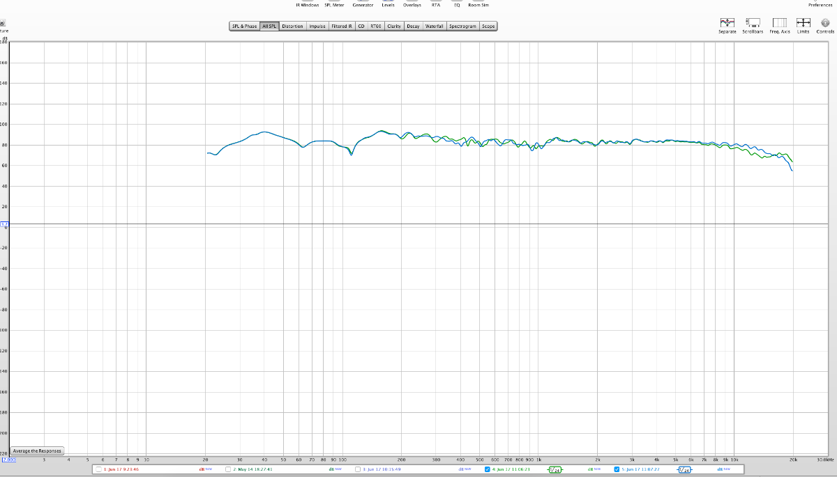 The blue REW is from the side of the room level with LP the Green is with the heavy drapes drawn and the red at LP at 38%, best spot. All swithces on the 310's are at 0dp. Quite the null. Sub?