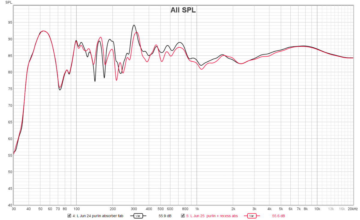 Frequency response plot for left speaker. Black is with only the cross beam absorbers I attached yesterday. Red with the newly added 200mm thick recessed absorbers. Some incremental improvements.