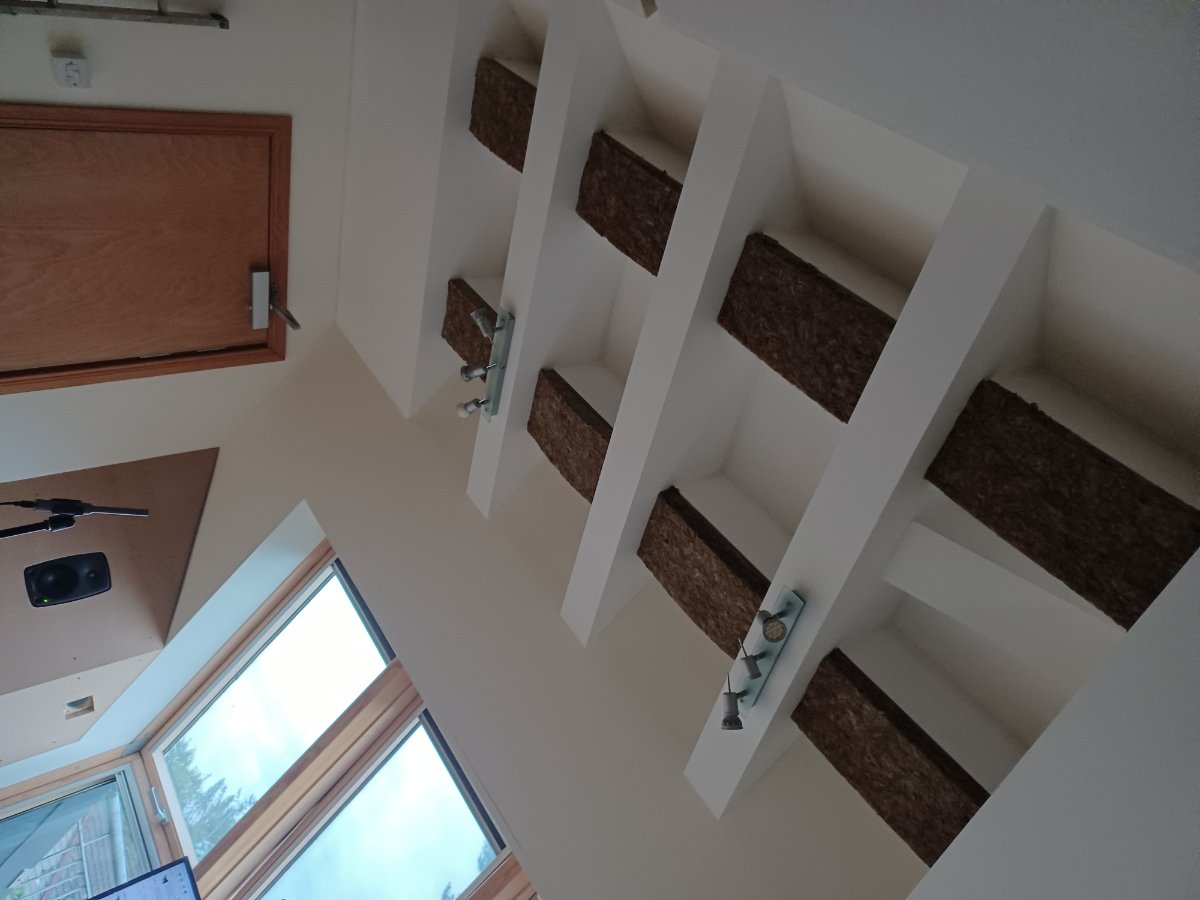 I've added some 50mm thick medium density insulation below the cross beam parts of the ceiling. Mainly to absorb any specular reflections or flutter echoes bouncing off them.