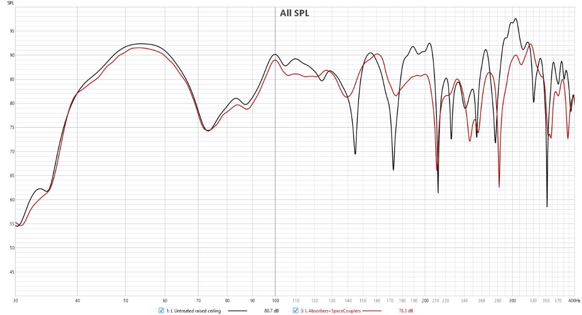 Untreated raised ceiling (black) vs ceiling with absorbers and space couplers (red), left:right: