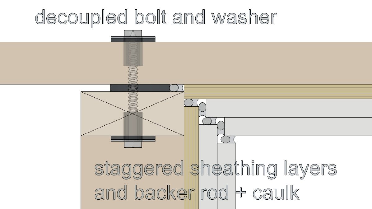 Yes, « the bolt and washer attached to the top plate also the bolt that runs through the pad and into the slats » but before inserting the bolt we inserted a piece of rubber hose up to the top of the slat, so the bolt and the washer do not touch the wood (the washer crushes the piece of hose that protrudes on the slat and on the bottom of the top plate) as we did to fix the walls on the exterior wall.