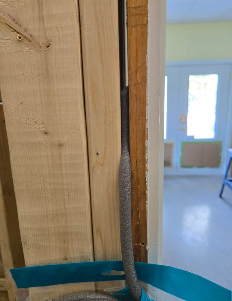 For sealing the door frame on the studio side, I could use a 1/2-inch backer rod and sealant. Then, 5/8-inch drywall will be installed over that.