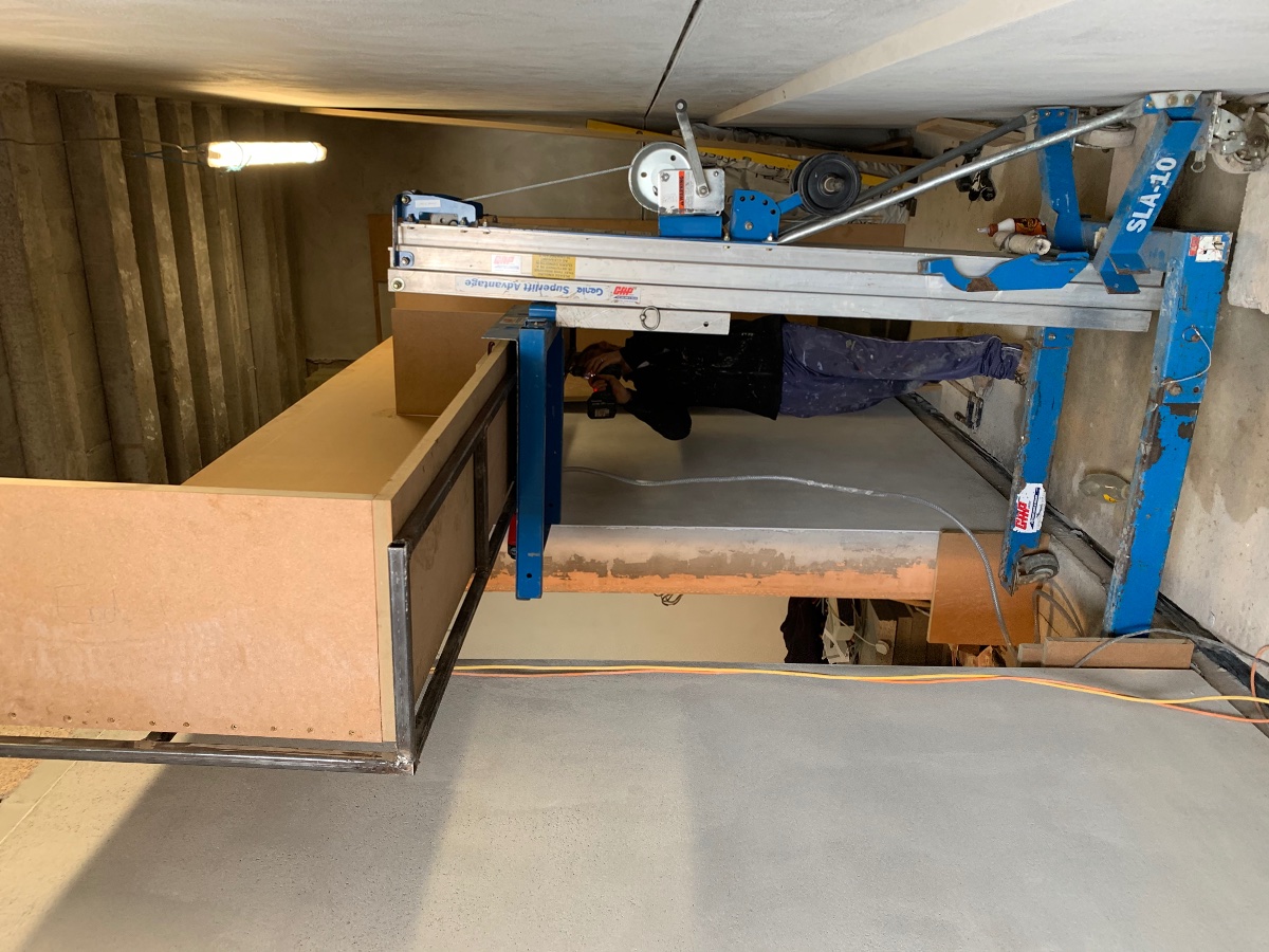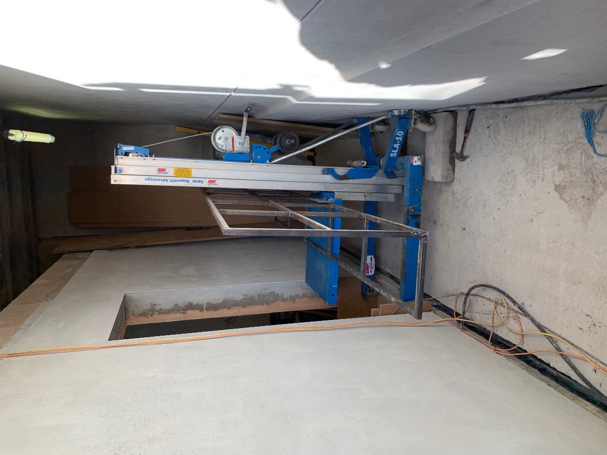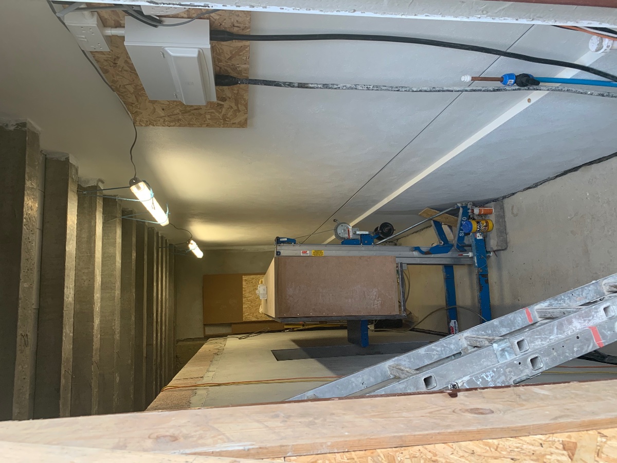It sits on a Genie lift which will winch up and down. We’re having to build the silencers in the corridor, which has limited width (1.4m).