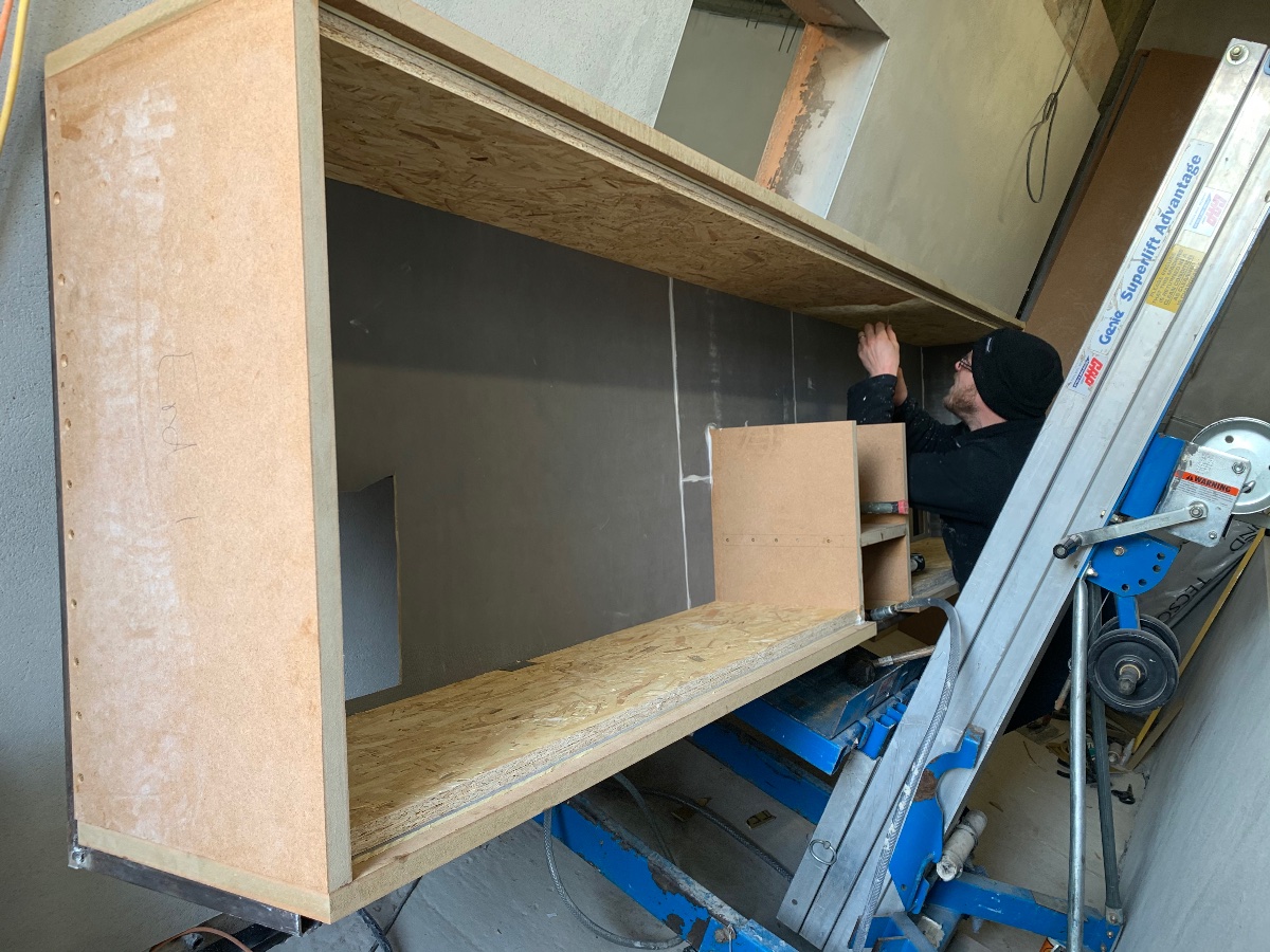 We tipped the box to the wall to aid installation. The metal frame shows no signs of bending yet!