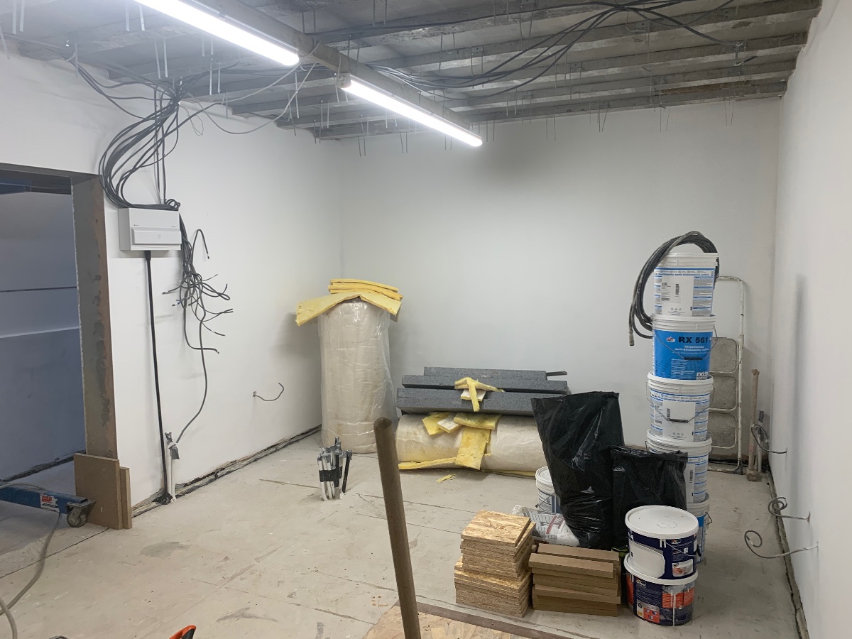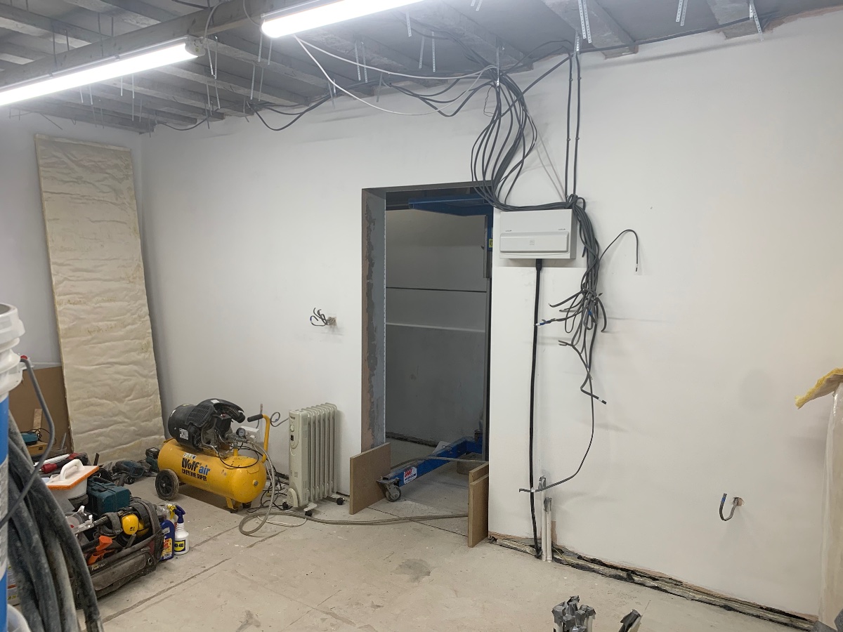 We did pain some of the corridor, the main room walls have had a mist coat and a full coat and sorted out the services coming in and out! We now have 4 x cat6 cables to a switch in the house so we have a wifi access point...no more leaving the phones at the door! I made the power connection and terminated at the building consumer unit, fitting a few sockets for our build use on the service board. I also wired up the cable to the studio consumer unit and wired a couple of sockets and put up a couple of very bright led batten lights which will end up in the corridor!
