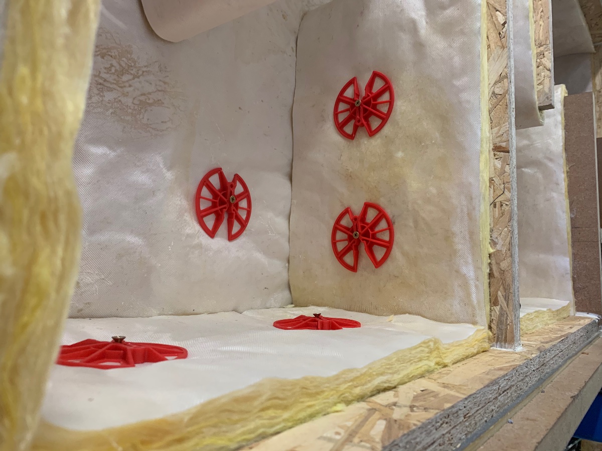 We weren’t overy confident in adhesive along keeping fibreglass to the OSB and no companies I could find here do proprietary duct liner fixings, so we improvised with cavity wall tie insulation clips to provide extra support... ran out of adhesive, then ran out of insulation clips.... buuut: