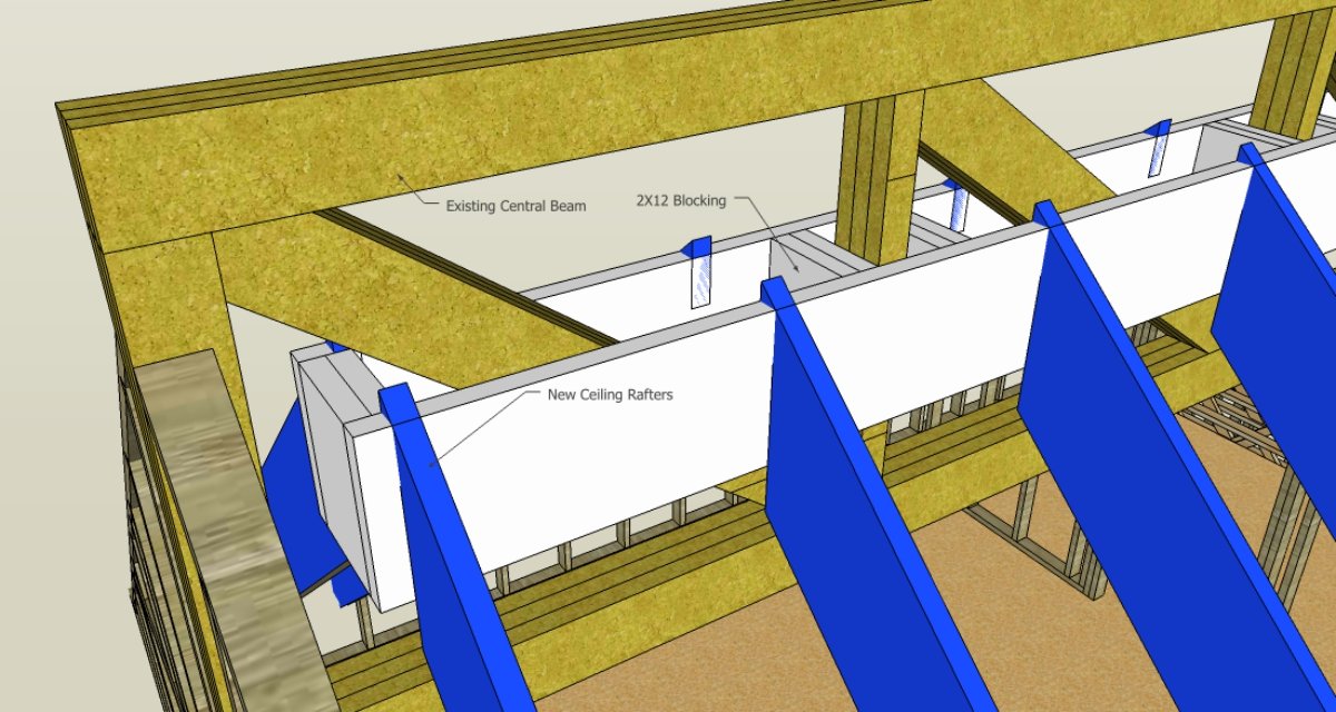 Sure. In yellow is the existing centra support beam. In blue are the new ceiling rafters. In white is wood blocking. The blue ceiling rafters would not touch the yellow support beam at all as the white wood blocking is interleaved in the yellow support beam while not touching it.Soundman2020 wrote: Maybe you could show some more images for that?