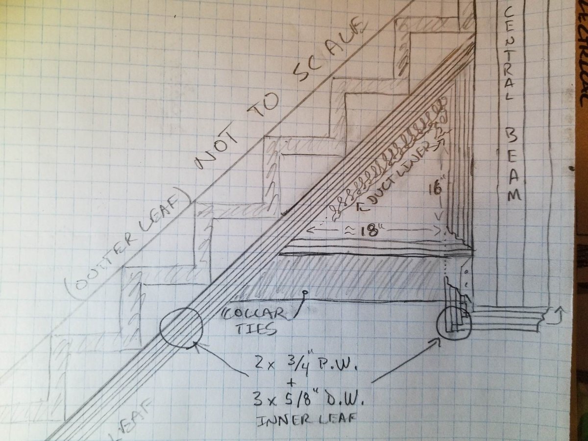 This would create a triangular space above the collar ties, below the inner leaf ≈ 18" wide, 16" high having a cross sectional area of ≈ 144 IN^2. This is about 3 times my required cross sectional area for 200Ft/Min velocity. So the idea would be to use these triangular spaces as expansion chambers to further lower my air velocities. The inside of these triangular voids would be lined with 2" of duct liner.