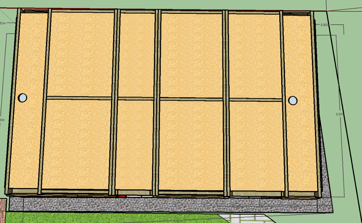 The whole building will be sunk into the ground so that the top of the concrete block is 350mm below ground level. This will give me enough head height whilst staying within the permitted development rules. The highest part of the building (the front) will be 2.4m about ground.