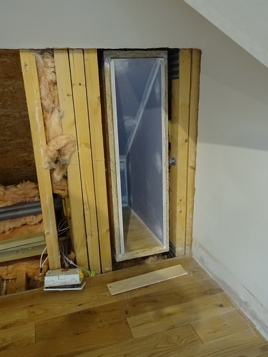 The trap / floor intersection is a bit trickier than the walls. There are mains cables running along on a plank across the joists under the traps. The plank doesn't go all the way across, so I will add one and clip the cables in place so it does;