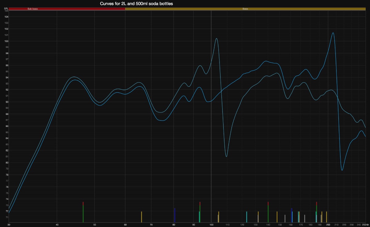 Interestingly, running an RTA with 1/48 octave bins while blowing across the two bottles gives peak frequencies of exactly 100 and 200Hz, respectively. The resonance points seen in the REW curves seem to occur at slightly higher frequencies. Not sure why that might be so (nor the exact band frequencies used for 1/48 octave RTA - maybe it's a resolution thing).