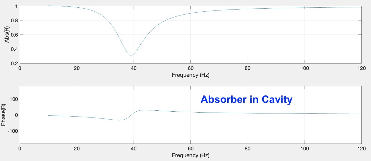 You can see the phase is a lot smoother, and doesn't vary more than 20-30 degrees either side of resonance. In both cases (with and without absorber in the cavity) you can see the dip in the magnitude of the reflection coefficient (which is another way of expressing the absorption coefficient).