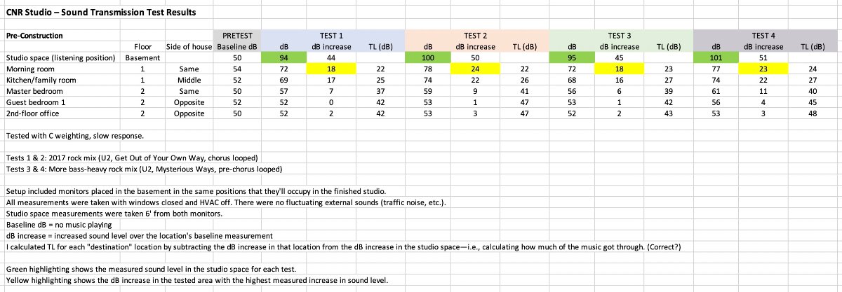 I was happy to discover that music at 100 dB in the studio space was completely inaudible on the opposite side of the 2nd floor, and the master bedroom, two floors directly above the studio space, only showed a bump of around 9 dB.