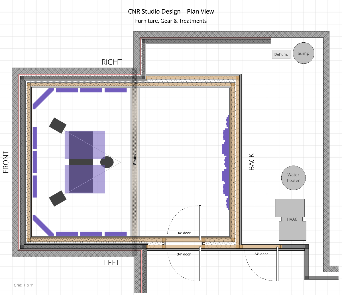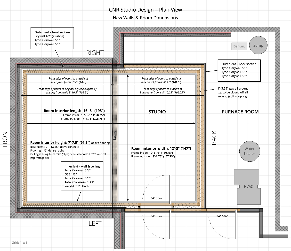 I want to start working with other musicians again soon, but that isn’t a significant concern for the studio design. The design that will meet my solo goals will be fine for two or three of us. I plan to have strong enough ventilation to keep the room comfortable for multiple people, and there’s a bathroom right at the top of the basement stairs. I will use it only as a personal/private studio (no commercial use).