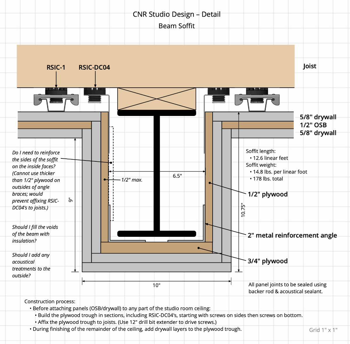 • Is the beam soffit designed with sufficient structural integrity? (Do I need to reinforce the plywood along the length and/or at the RSIC attachment sites?)