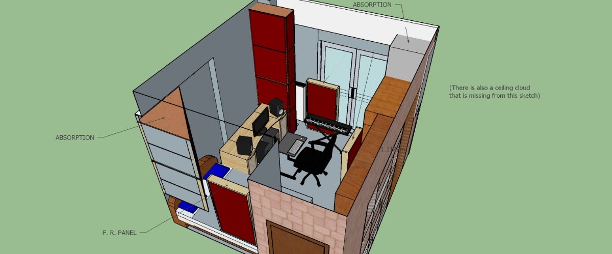 Related to the above, there are several "philosophies" or "concepts" for building control rooms, with names like "NER", "RFZ", "CID", etc. Each of those precisely defines the acoustic response characteristics that the room must achieve. One of those is the ideal "20-20" criteria, which means "20ms delay, 20 dB down". (And that's also where my screen name comes from! "SOUNDMAN2020" has nothing at all to do with the year 2020.... I've been using it that name more than a decade now! It's all about this "20-20" criteria that a room must meet in order to be good: no reflections greater than -20 dB in the first 20ms). Now, that's the ideal situation: to not have any reflections at all for the first 20ms, but to do that properly means that you need a large room. Sound travels roughly one foot for every millisecond, so you need to have at least ten feet between your head and the closest reflective surface behind you, plus there's often a 3 foot deep bass trap behind that reflective surface, so you need at least 13 feet distance just behind your head, plus a corresponding distance in front of you... thus, a room that fully meets the 20-20 criteria needs to be abut 20 feet long. That's a bit more than 6m long. Most home studios are not big enough to do that, so we have to make do with shorter times. 15ms is reasonable, and down to about 12ms is still acceptable. Now, as I mentioned before, as the delay time gets shorter, the level needs to be lower in order to not produce serious psycho-acoustic artifacts. So, while a level of -10dB might be fine for a large room with a long 25ms delay, you do need more attenuation for a small room.
