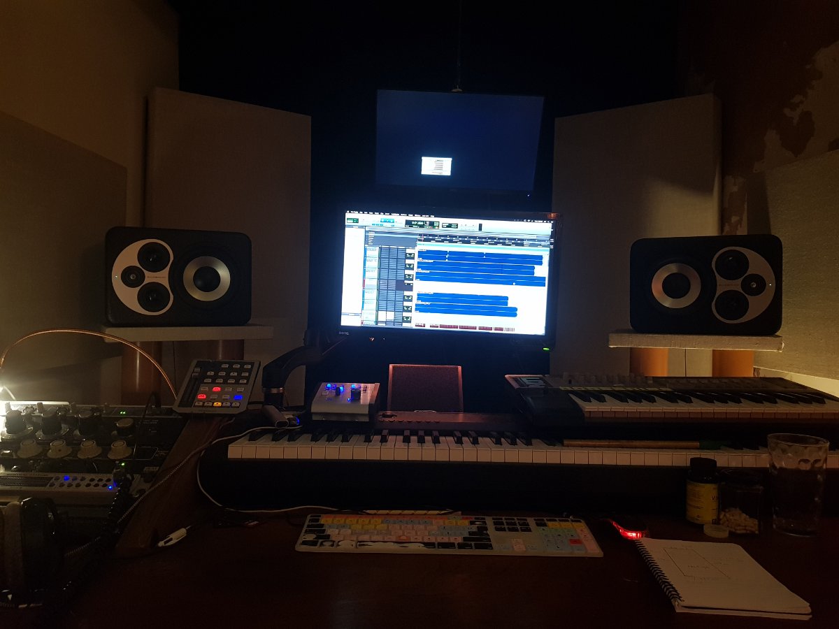 I know why it looks like that, it's because my desk is too high! The monitor in the picture is also much higher than it would be when I'm mixing (it's on an adjustable arm). Part of this studio refurb is to build a new desk that is lower and adjustable in height. The speakers are actually perfect ear height at comfortable sitting level.